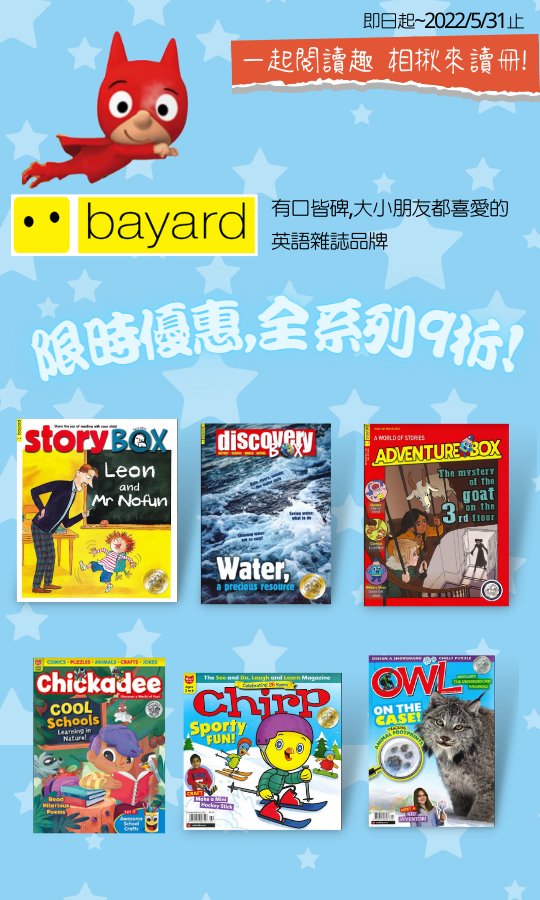 來自法國的Bayard Presse 致力於培養兒童終身閱讀熱情,英國子公司Bayard Jeunesse 所出版的三階段英語兒童雜誌 : Story box、Adventure box 以及Discovery box,皆曾榮獲全球最具公信力的Parent’s Choice Award。
